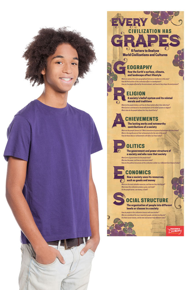 By using a simple mnemonic device, this skinny poster illustrates the factors that characterize any civilization: Geography, Religion, Achievements, Politics, Economics, and Social Structures. Use this poster when introducing any ancient civilization to your students. It works with classifying present-day civilizations, too!