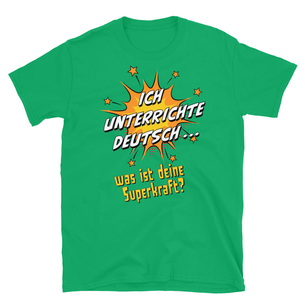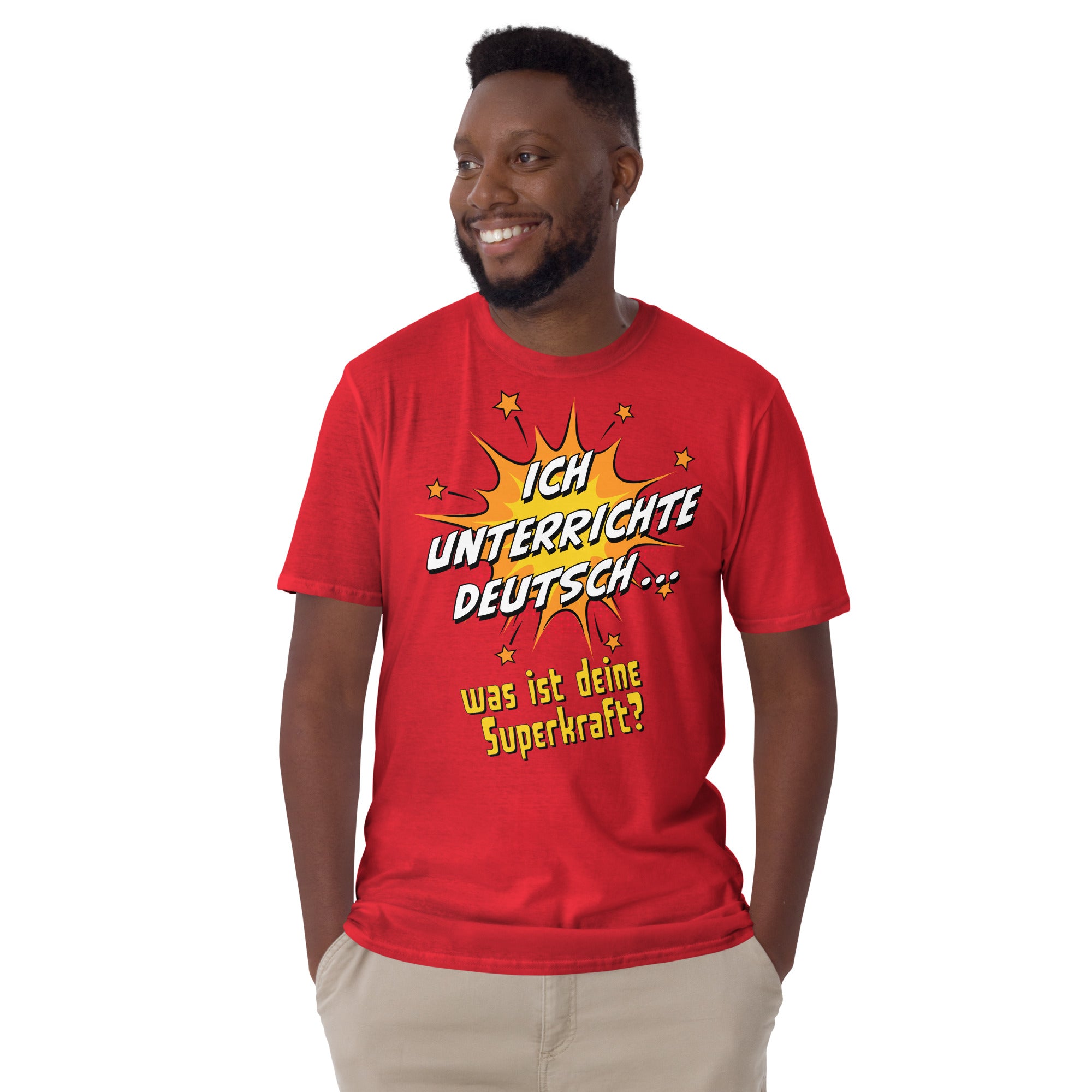 I teach German...what's your superpower? Unisex German T-Shirt - Black / S is backordered and will ship as soon as it is back in stock.