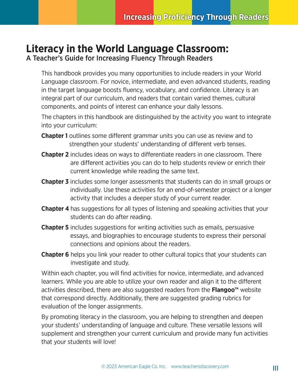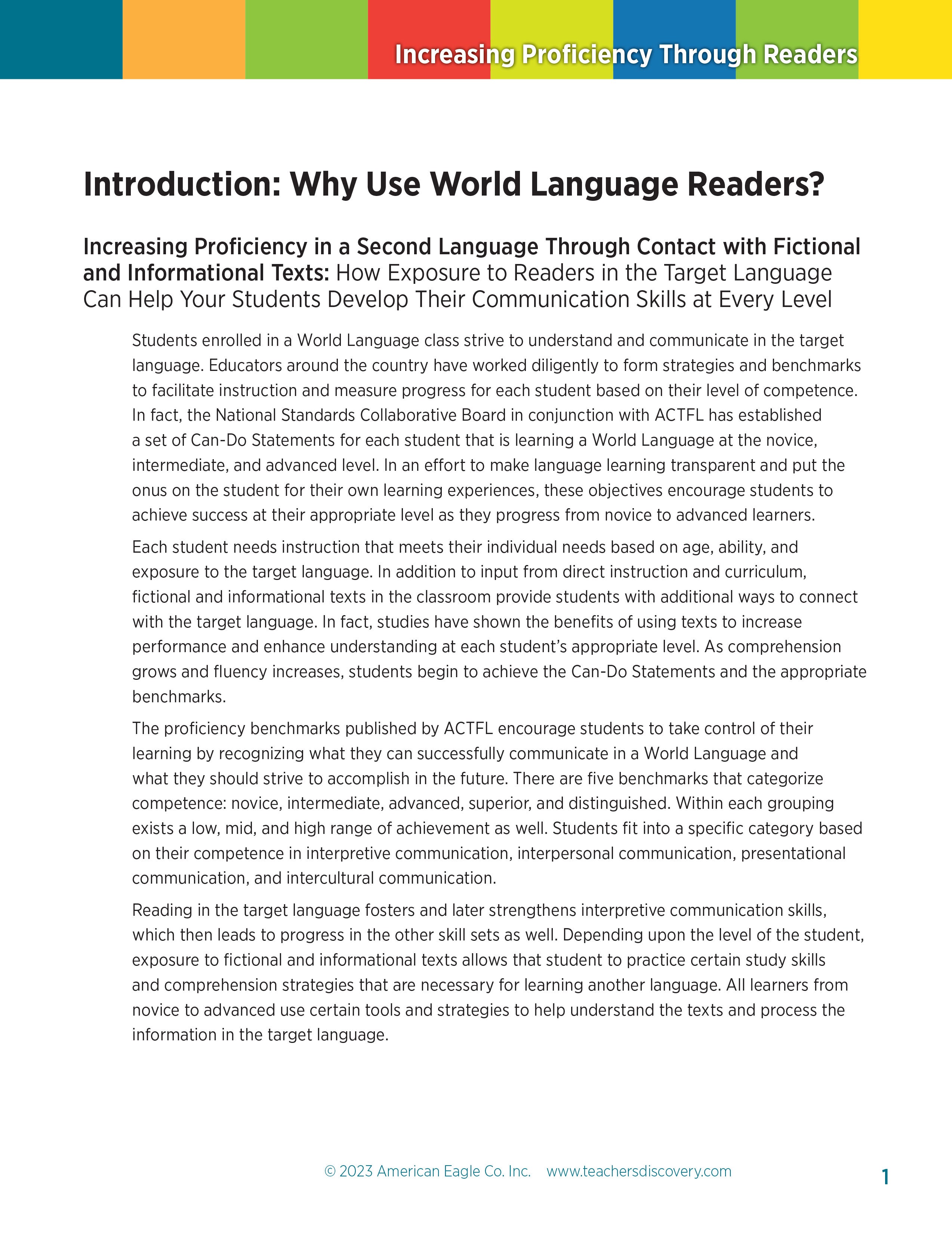 Increasing Proficiency Through Readers showcases opportunities to include readers in your world language classroom. Literacy is an integral part of every curriculum. Promoting literacy strengthens and deepens the students' understanding of language and culture. Proven at all levels, students reading in the target language boosts fluency, vocabulary, and confidence. Readers that contain varied themes, cultural components, and points of interest strongly enhance daily lessons. Detailed in this guidebook is how to utilize your favorite reader and align it to the different activities described. There are also suggested readers from the Flangoo website, helpful grading rubrics for evaluation of longer assignments, and other "novel" ideas!