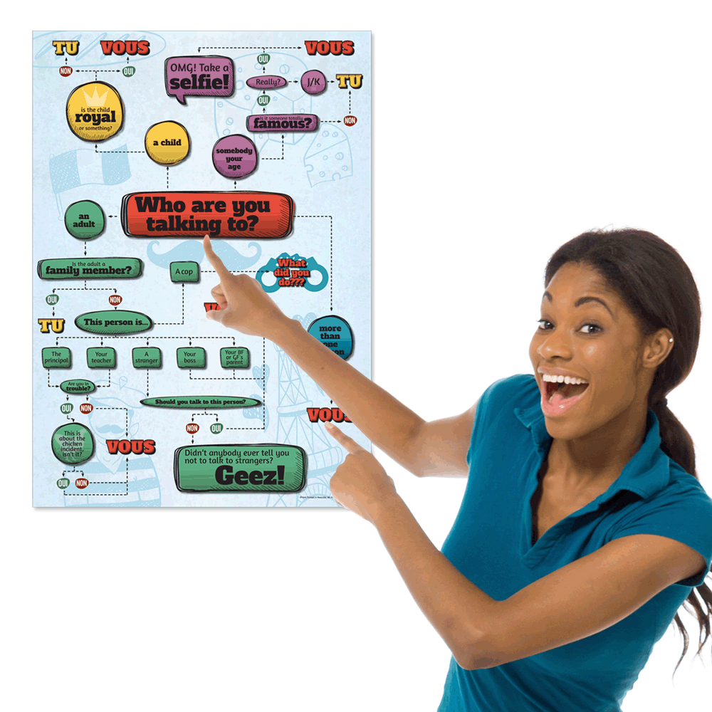 This flowchart tells your students which pronoun to use and when! Whether it's someone totally famous (OMG selfie!) or an officer of the law (What did you do?!), students will always know what to say! ©2015. 19 x 27 inches. Laminated.