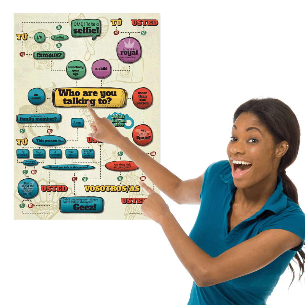 This flowchart tells your students which pronoun to use and when! Whether it’s someone totally famous (OMG selfie!) or an officer of the law (What did you do?!), students will always know what to say! ©2015. 19 x 27 inches. Laminated.
