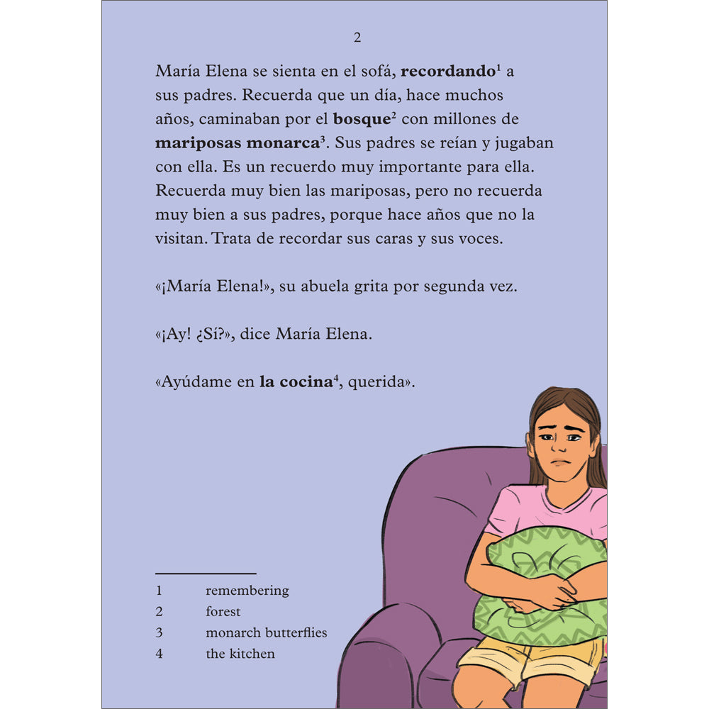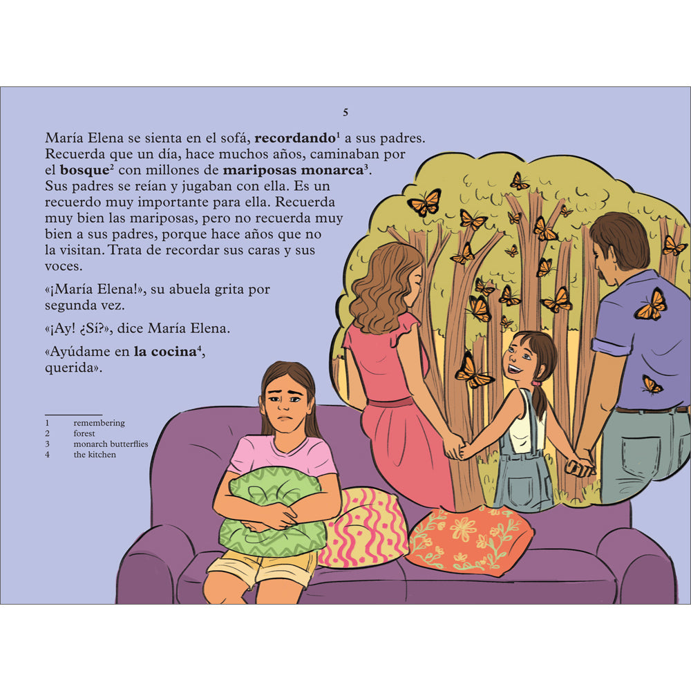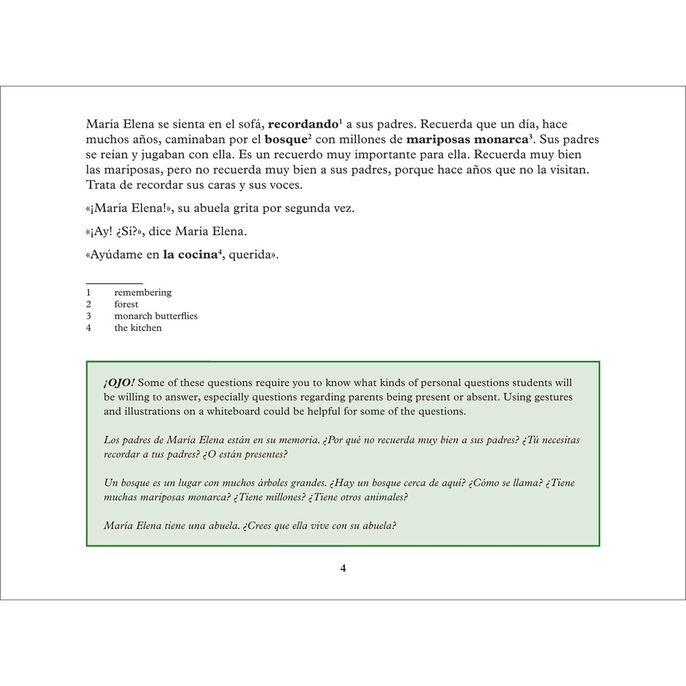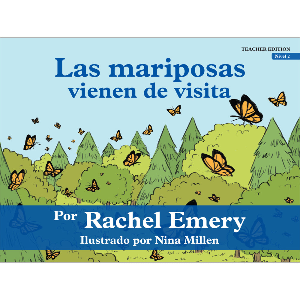 Las mariposas vienen de visita Spanish Level 2 Teacher Edition is a “storytelling” reader set up so that you, the teacher, can read the story to the whole class while students follow along. The Level 2 Teacher Edition includes embedded scripts with questions and tips for establishing and extending meaning. Each page is double-sided so that teachers can easily read the story and questions to students while they follow along and look at the full-color illustrations on the other side.