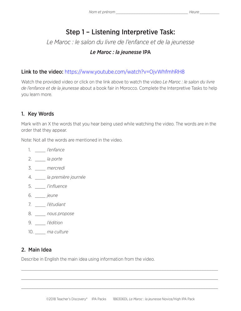 This IPA Download Pack is based on two authentic resources: an article that describes a youth center located in Morocco and a short video Le Maroc : le salon du livre de l’enfance et de la jeunesse about a book fair in Morocco in 100% French.