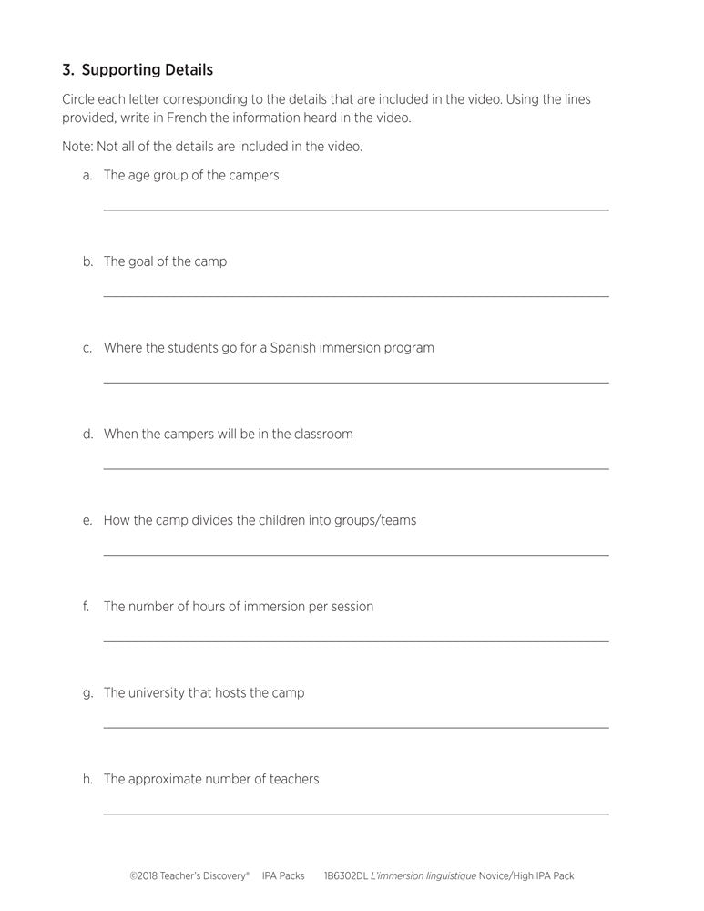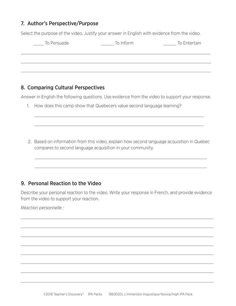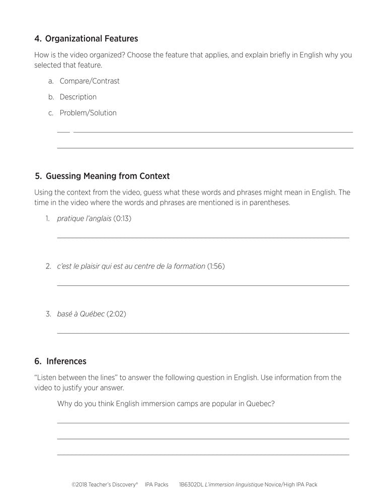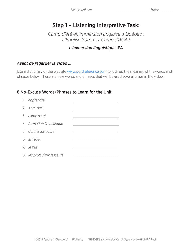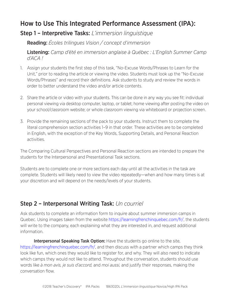 This IPA Download Pack is based on two authentic resources: an article that describes the mission of École Vision, a private school in Quebec, Canada, and their vision of immersion schools and a short video Camp d'été en immersion anglaise à Québec : L'English Summer Camp d'ACA !, which shares information about a French- Canadian summer camp in 100% French.
