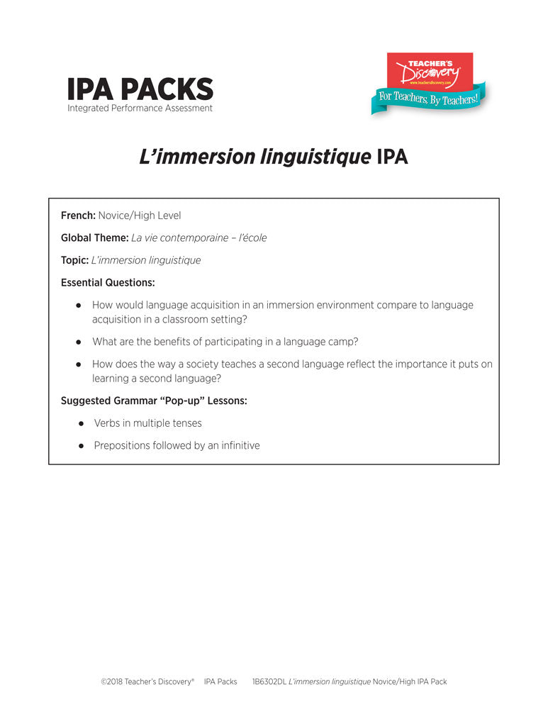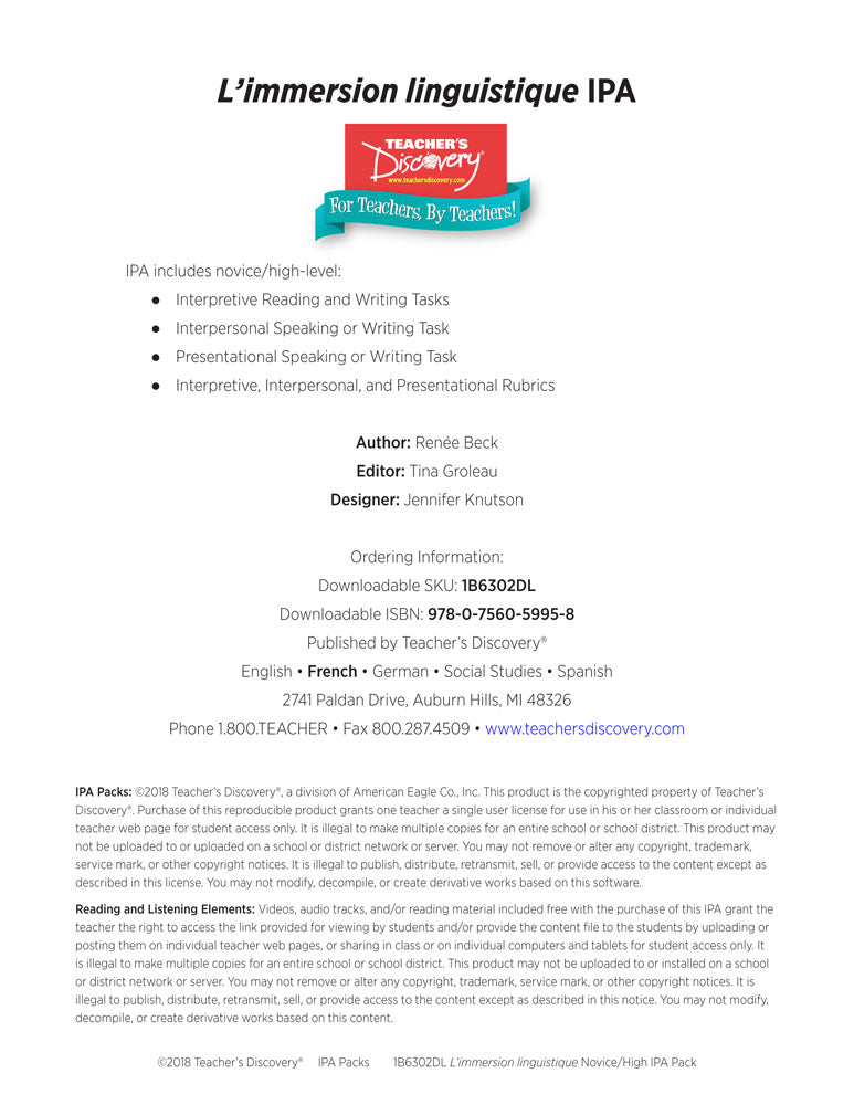 L'immersion linguistique Novice-High French IPA Pack - DIGITAL RESOURCE DOWNLOAD