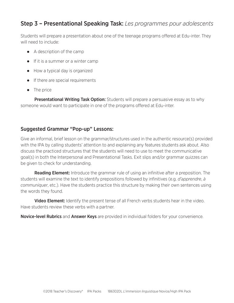 The pack includes step-by-step instructions, and reading and listening comprehension activities that follow the ACTFL model. Complete with an explanation of an IPA and how to use it, and nine Interpretive Tasks that break down the content, increase recognition of key words and phrases, develop context awareness, and promote language usage. In addition, it provides creative options for writing and/or speaking Interpersonal and Presentational Tasks, answer keys, and novice-level rubrics.