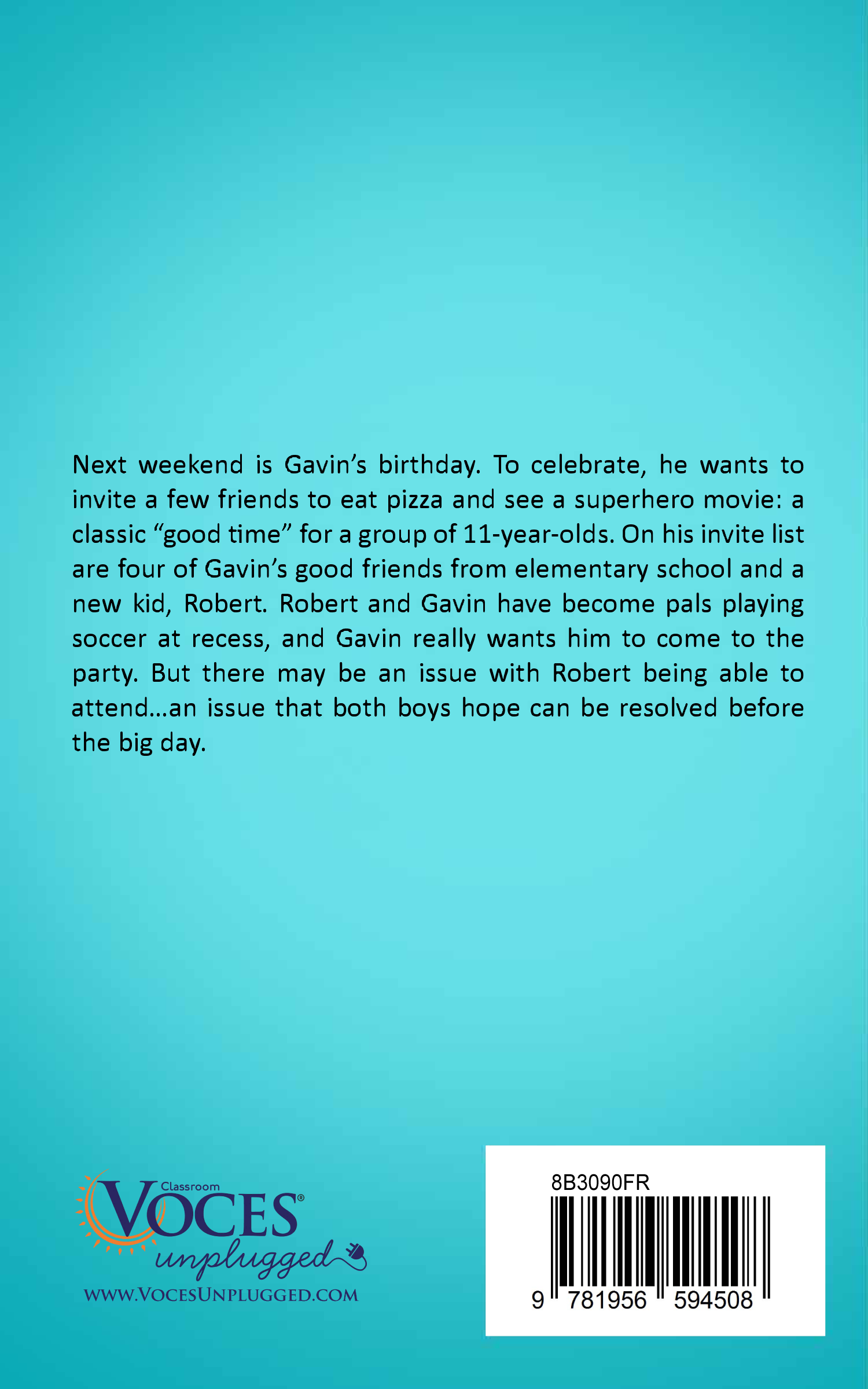 Next weekend is Gavin’s birthday. To celebrate, he wants to invite a few friends to eat pizza and see a superhero movie; a classic “good time” for a group of 11-year olds. On his invite list are four of Gavin’s good friends from elementary school and a new kid, Robert. Robert and Gavin have become pals playing soccer at recess, and Gavin really wants him to come to the party. But there may be an issue with Robert being able to go to attend…an issue that both boys hope can be resolved before the big day.