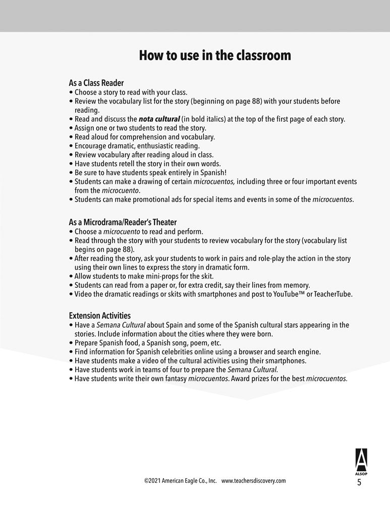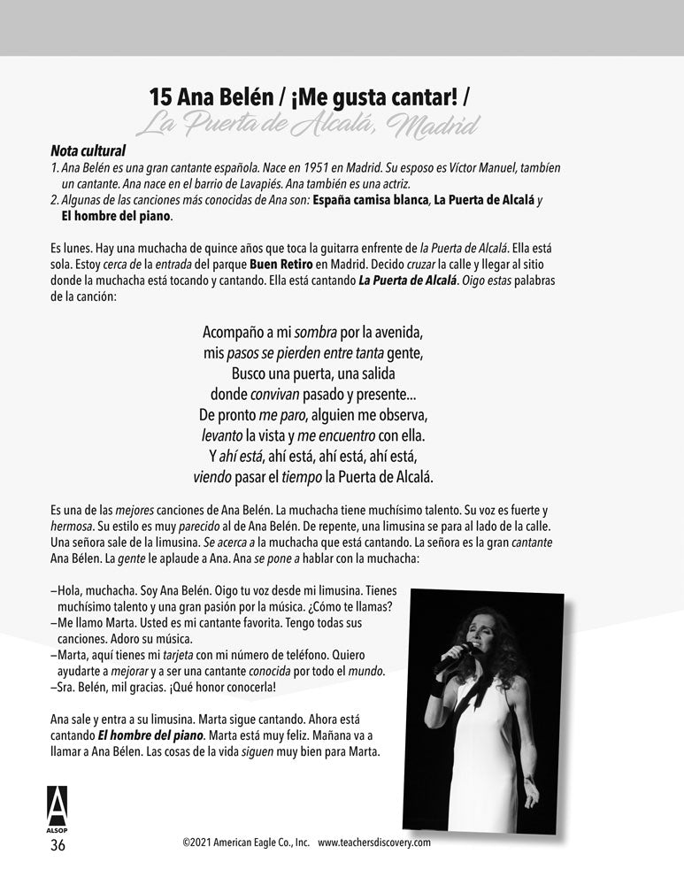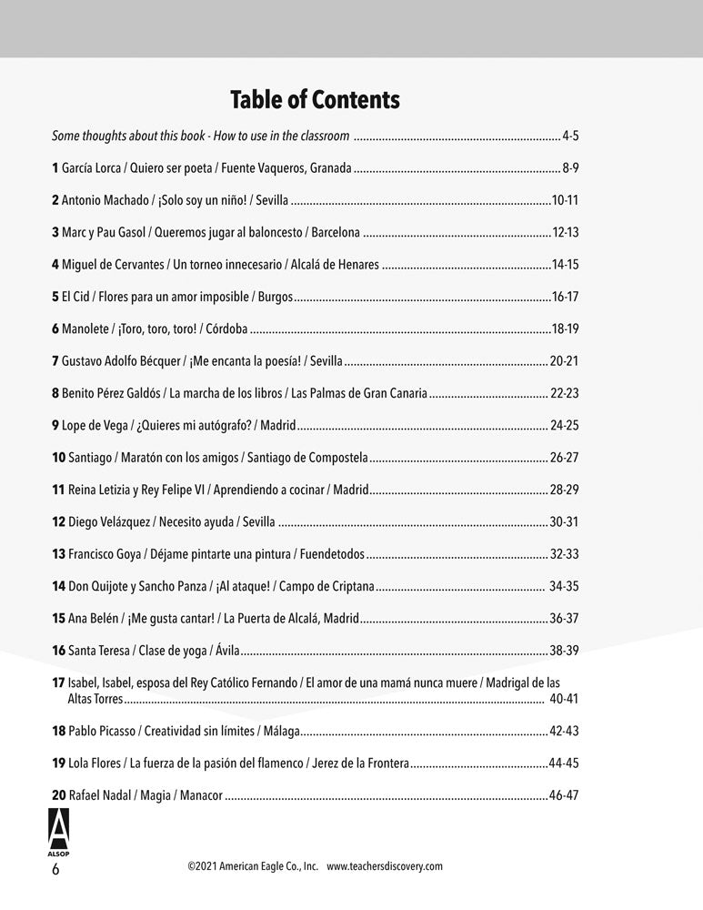 Take your students to the streets of Barcelona, Madrid, Sevilla, Oviedo, and beyond with microcuentos—super short stories with fantasy endings. Each story uses magic realism to introduce important people and places from Spain. At each of these places, learn about a prominent figure—a musician, singer, writer, painter, athlete, king, queen, bullfighter, actor, architect, warrior, and many more.