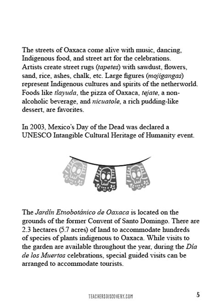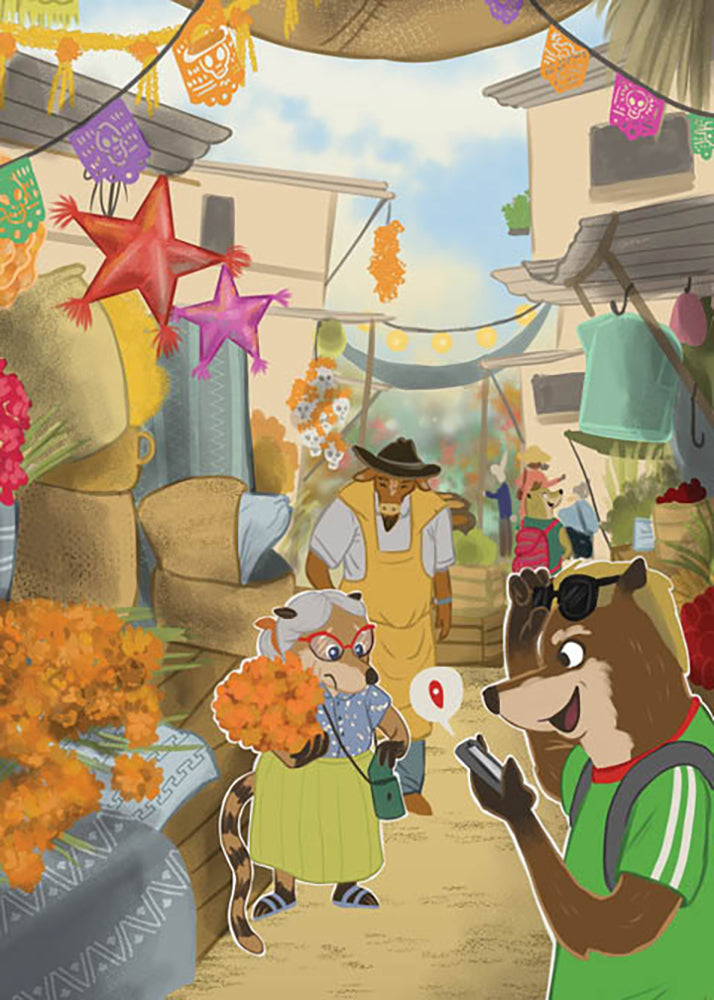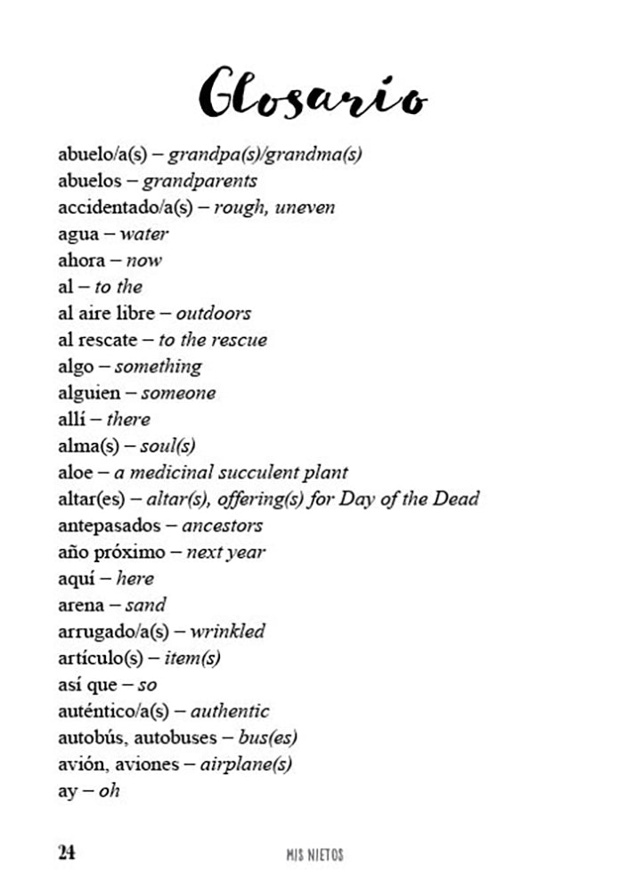 Mis nietos brings back two competitive coati cousins, Carlos and Marco. When their Abuela Inés invites them to spend el Día de los Muertos in Oaxaca with her, they are eager to learn the history and symbolism of this special day. As they shop for the traditional items—pan de muertos, copal, flores de cempasúchil, papel picado, calaveras, and velas—they marvel at the street tapetes, the mojigangas, and the delicious nicuatole associated with Day of the Dead in Oaxaca.