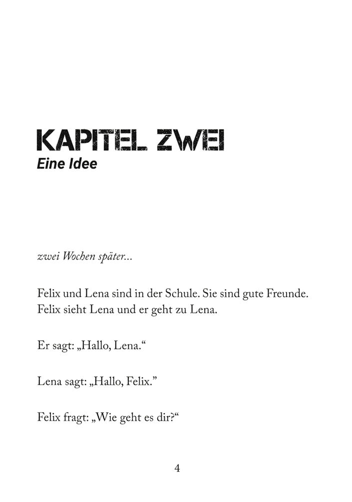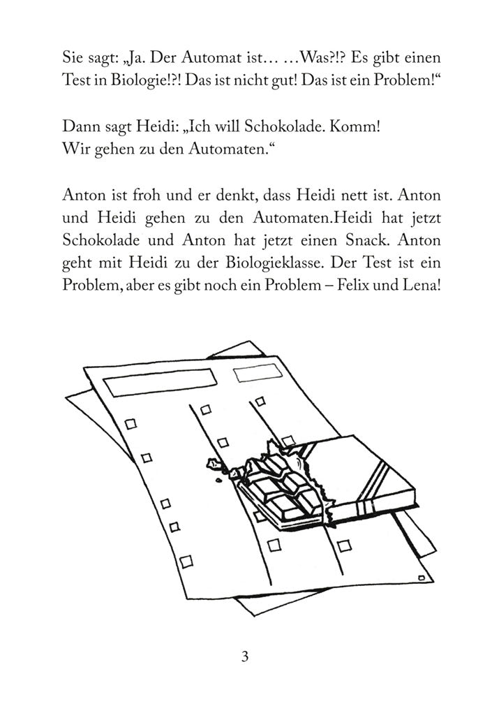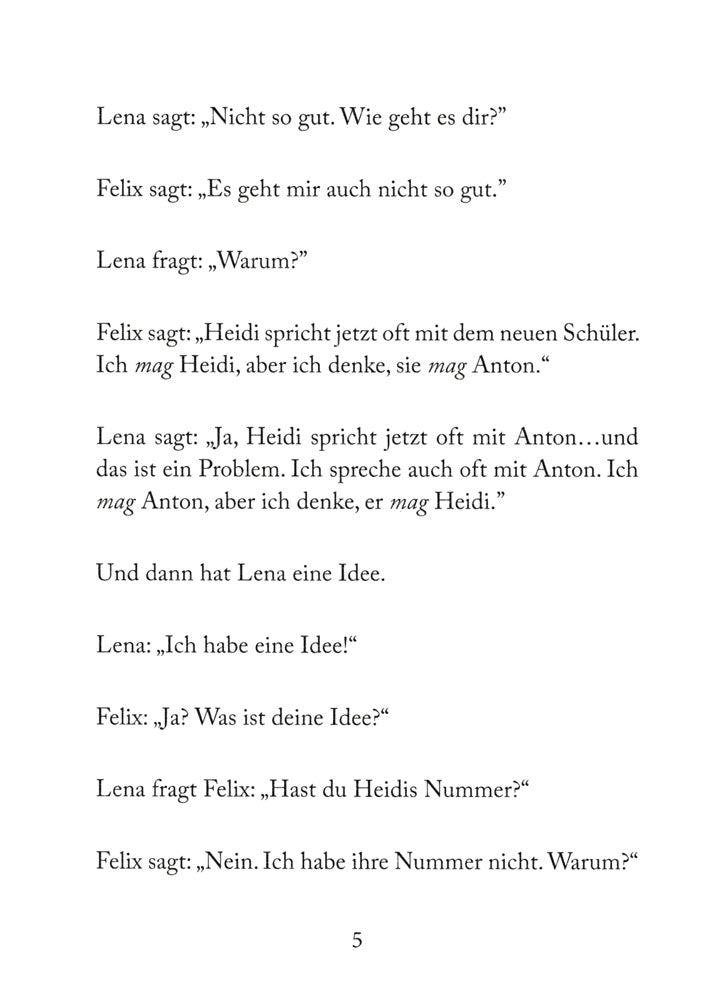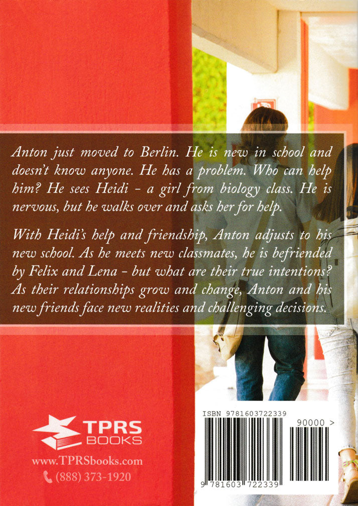 Anton sagt: „Ja. Ich bin neu in der Schule.“ Written for novice-level students, this chapter book incorporates thematic vocabulary, embedded elements, and dialogue. It is easily incorporated into a variety of teaching styles, including traditional, communicative, thematic, TPRS, and CI. Sections at the end of the book feature both comprehension and personalized questions.