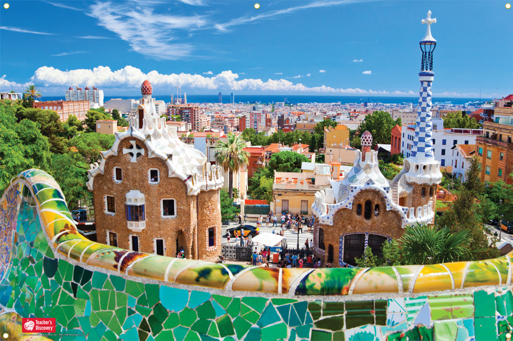 This vibrant, large-size mural transports your Spanish classroom to Antoni Gaudí’s Park Güell in Barcelona, Spain. Display it as a decoration or use it as a backdrop for Spanish conversations, skits, and presentations.