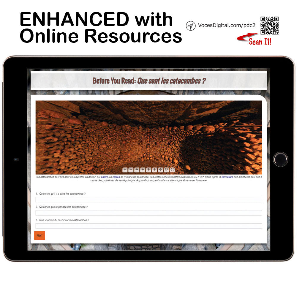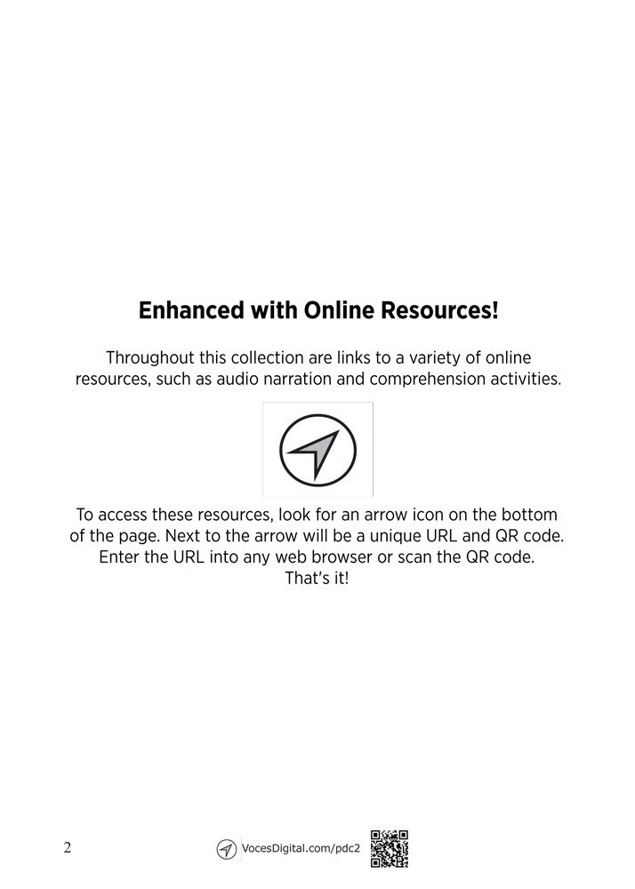 Throughout this collection are links to a variety of online resources, such as audio narration and comprehension activities. To access these resources, look for an arrow icon on the bottom of the page. Next to the arrow will be a unique URL and QR code. Enter the URL into any web browser or scan the QR code with your smartphone or tablet. That's it!