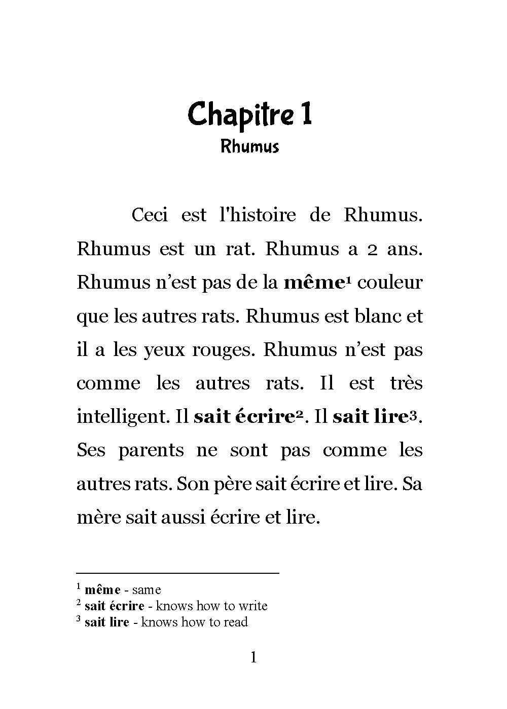 Rhumus is a rat who can read and write. He lives under the streets of Paris, France, with his mom and dad. One day, the rats experience a loud explosion that not only separates Rhumus from his parents but also leaves him hard of hearing. How will Rhumus be able to find his parents if he can't hear? Will he venture alone into the streets of Paris? Can his special talent help him to find his family? Written by Theresa Marrama.