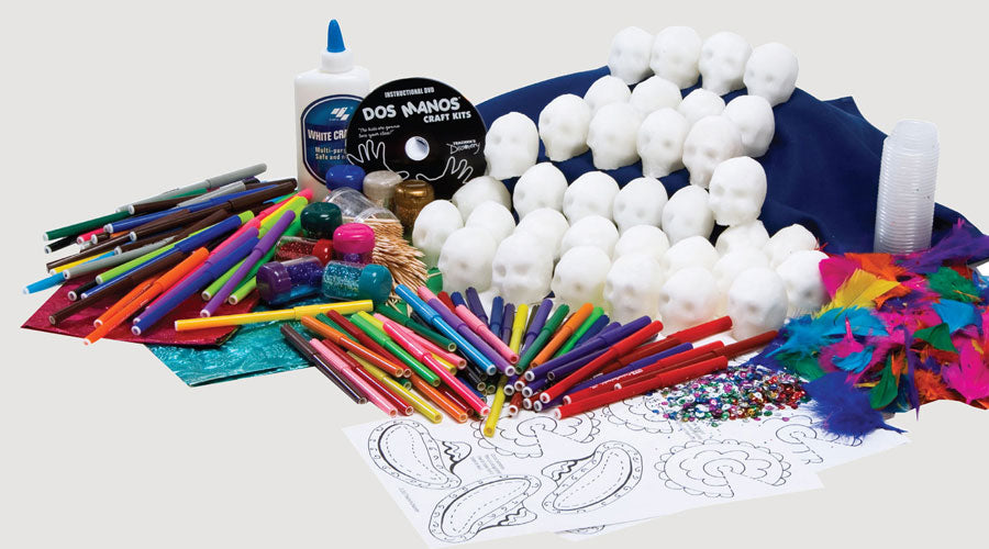 Sugar Skull Kit includes enough sugar skulls, sequins, glitter, glue, foil, feathers, and paper hat patterns to make 30 skulls.