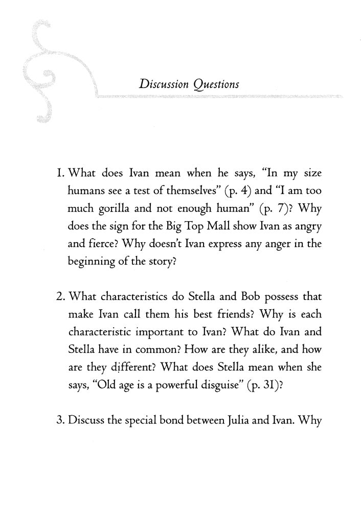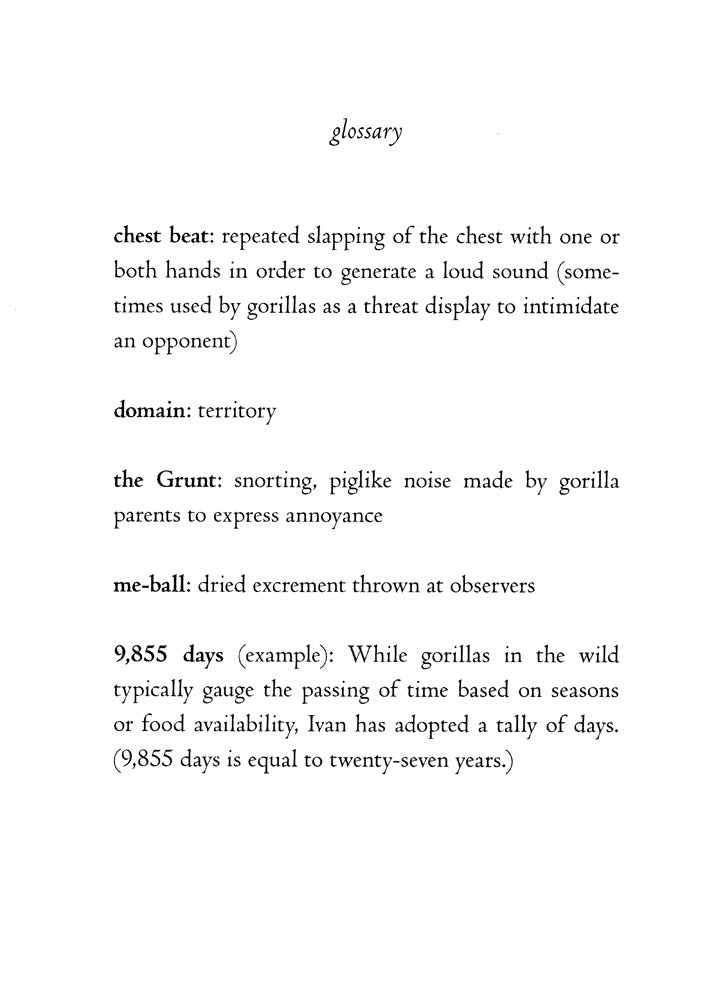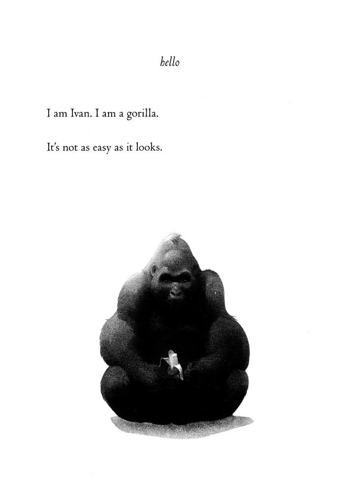 Ivan is an easygoing gorilla. Living at the Exit 8 Big Top Mall and Video Arcade, he has grown accustomed to humans watching him through the glass walls of his domain. He rarely misses his life in the jungle. In fact, he hardly ever thinks about it at all.