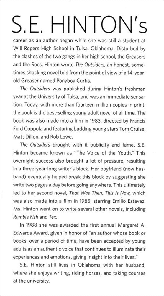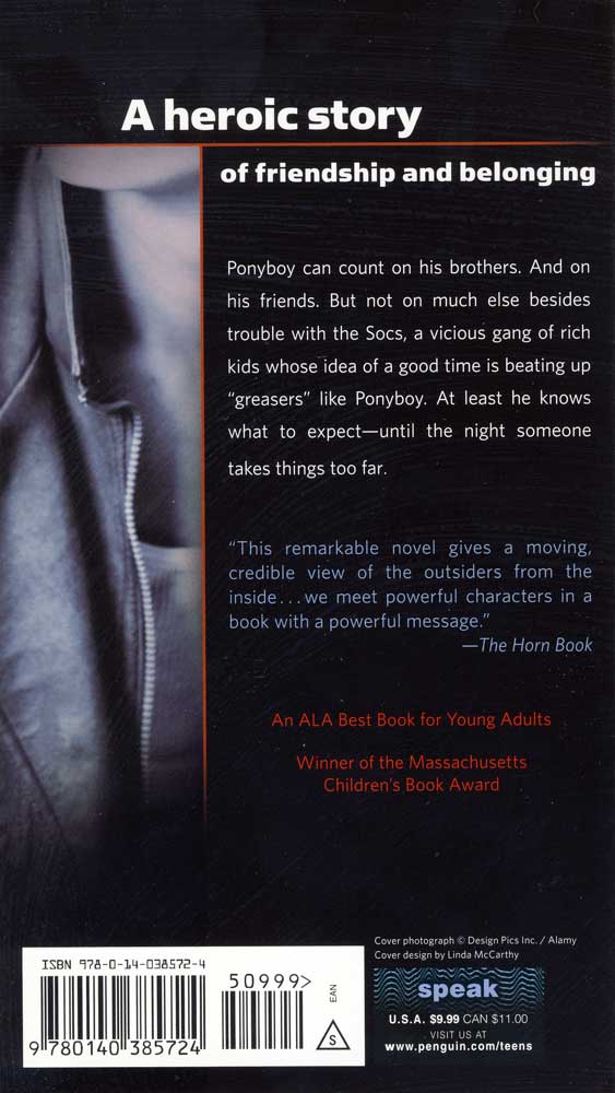 In Ponyboy's world there are two types of people. There are the Socs, the rich society kids who get away with anything, then there are the greasers, like Ponyboy, who aren't so lucky. Ponyboy has a few things he can count on: his older brothers, his friends, and trouble with the Socs, whose idea of a good time is beating up greasers. At least he knows what to expect-until the night things go too far. ~Written over 40 years ago, The Outsiders> continues to reach students today through its true portrait of the bonds and boundaries of friendship.